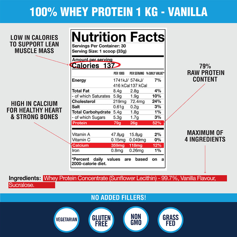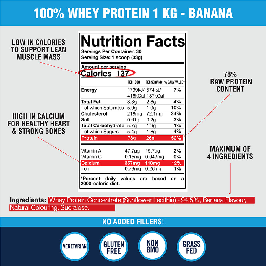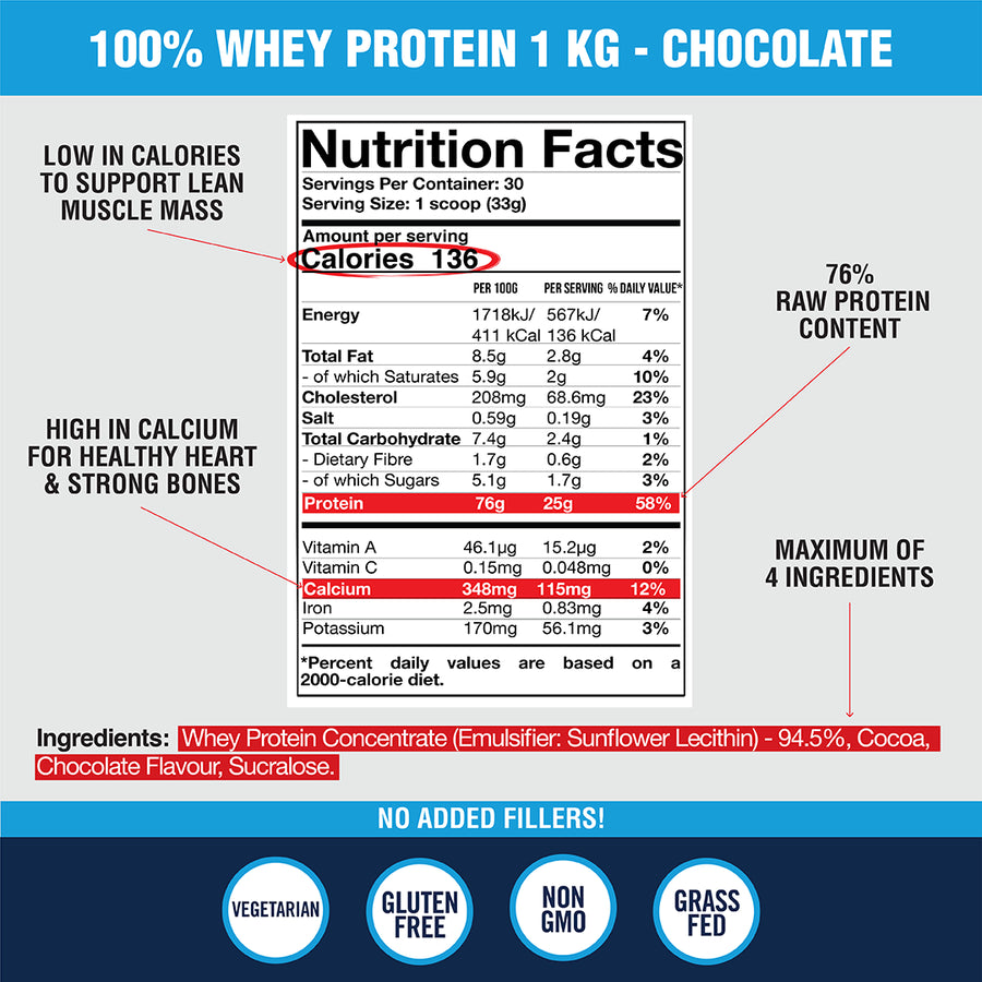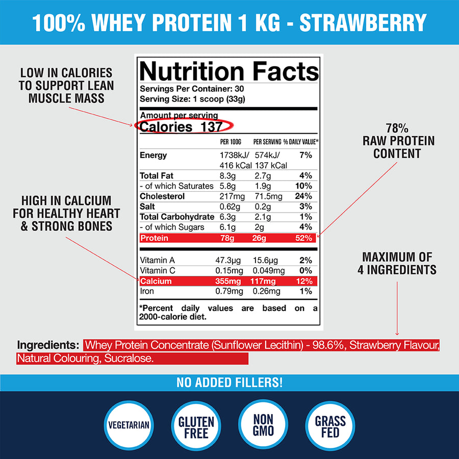 100% Whey Protein - Grass Fed & Maximum of 4 Ingredients - 1kg (30 servings)