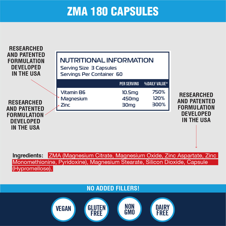 ZMA is a powerful and patented formula combination of zinc and magnesium plus vitamin B6. Each of these minerals play essential roles in the human body which result in ZMA® providing a number of benefits to the body and its function.